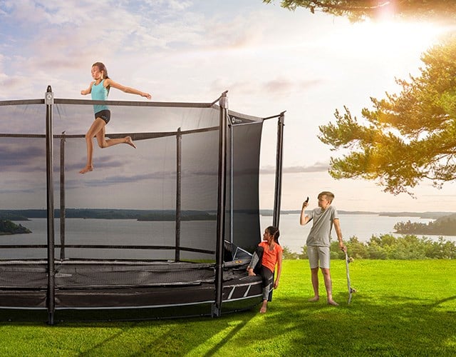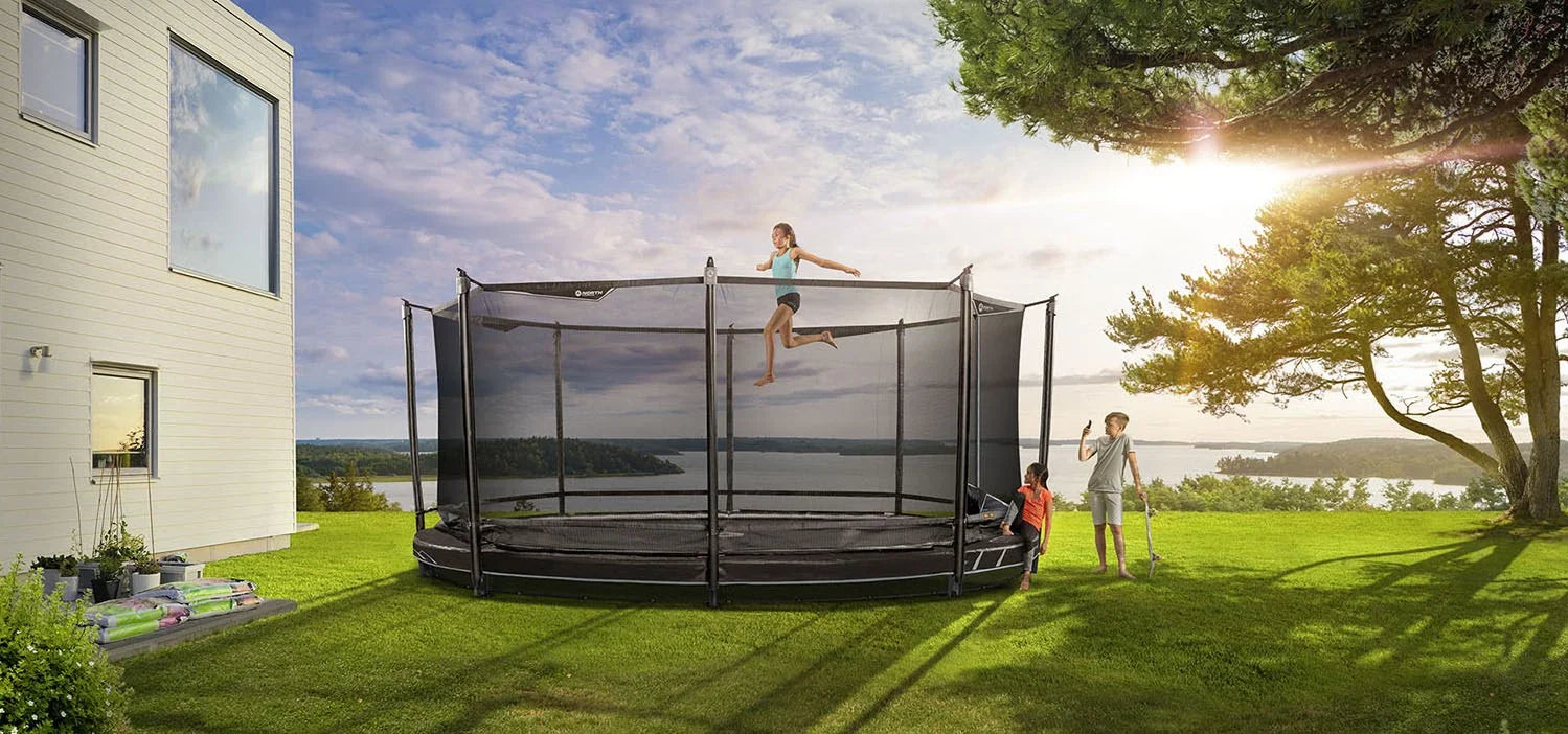 Letar du efter en nedgrävningsbar studsmatta som smälter in bättre i trädgården och som samtidigt är ännu säkrare – då har du hittat rätt! Legend Low finns som oval, rund eller rektangulär och du kan välja mellan svart, petrol eller maroon-färg. En riktigt snygg studsmatta i trädgården!